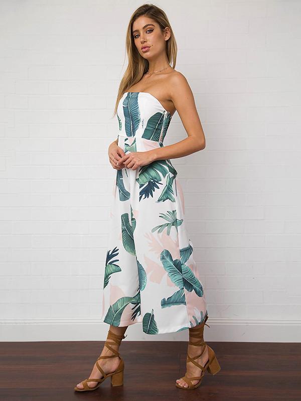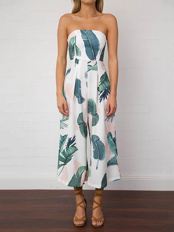 Leaves Printed Backless Off-the-shoulder Long Jumpsuits