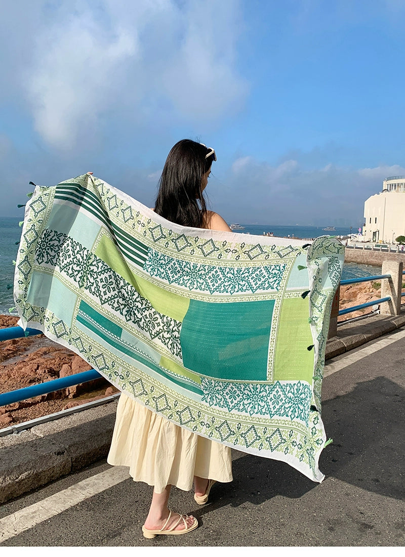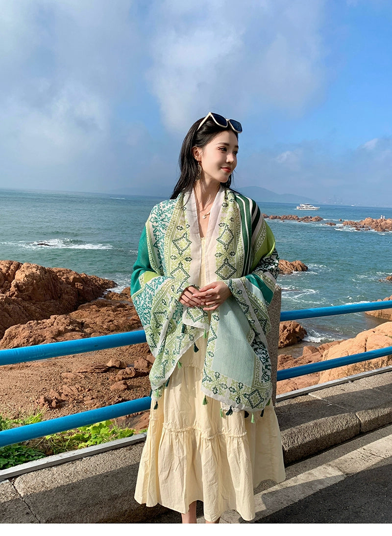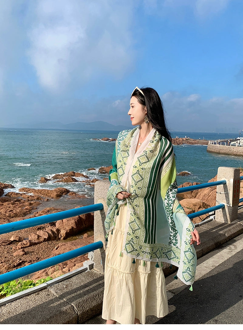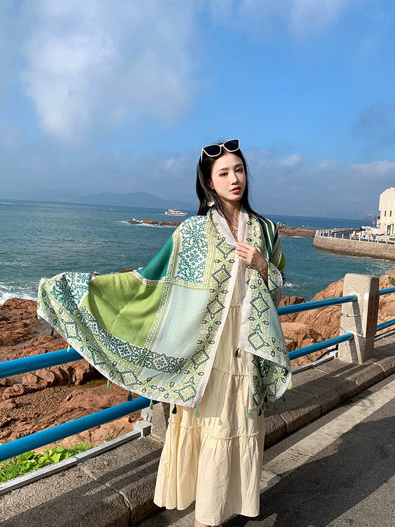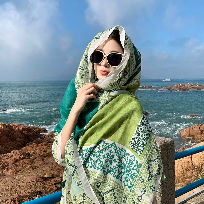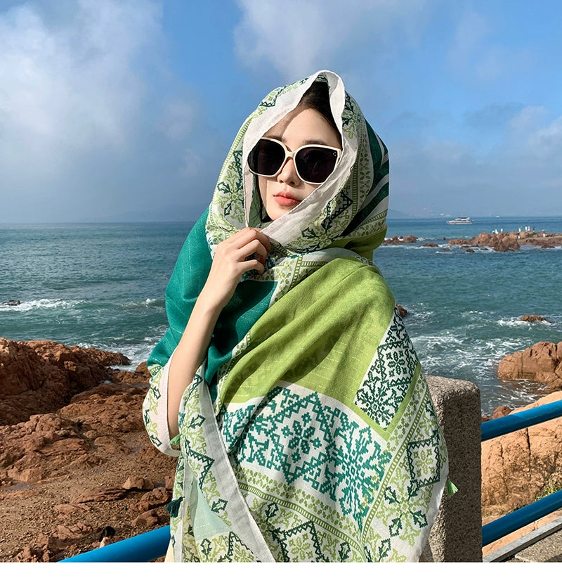 Fresh Green Ethnic Style Silk Scarf Women's Summer Sunscreen Dual-purpose Large Shawl Beach Towel Thin Cotton and Linen Scarf Yarn
