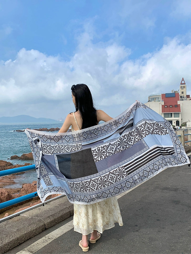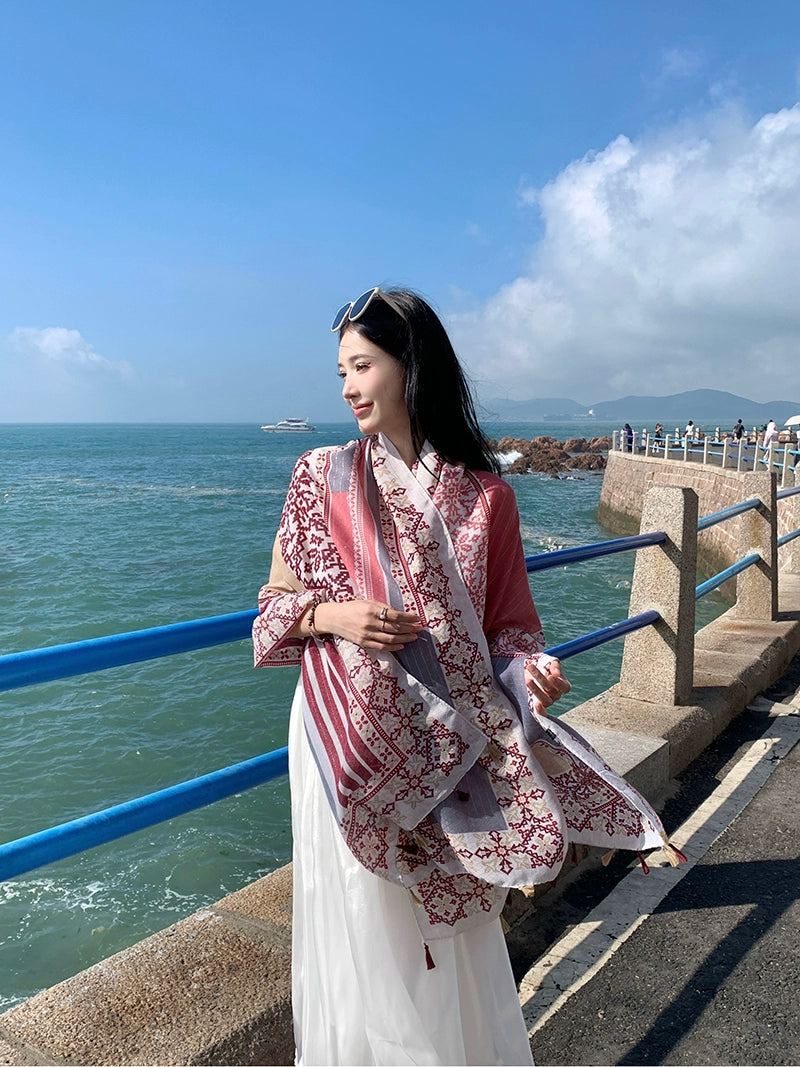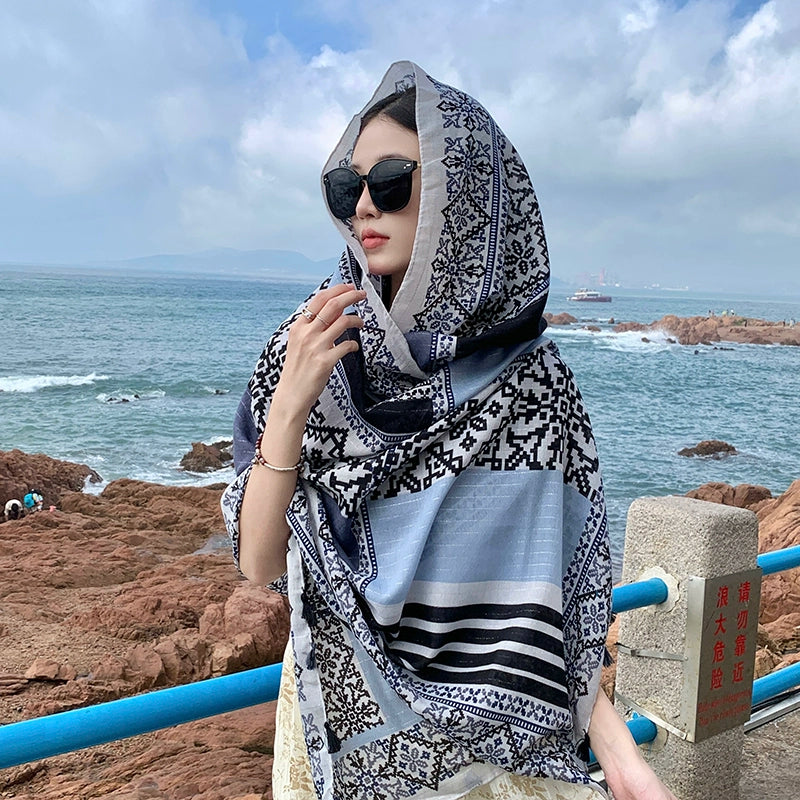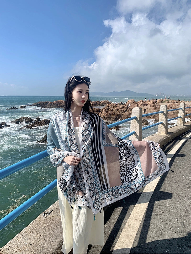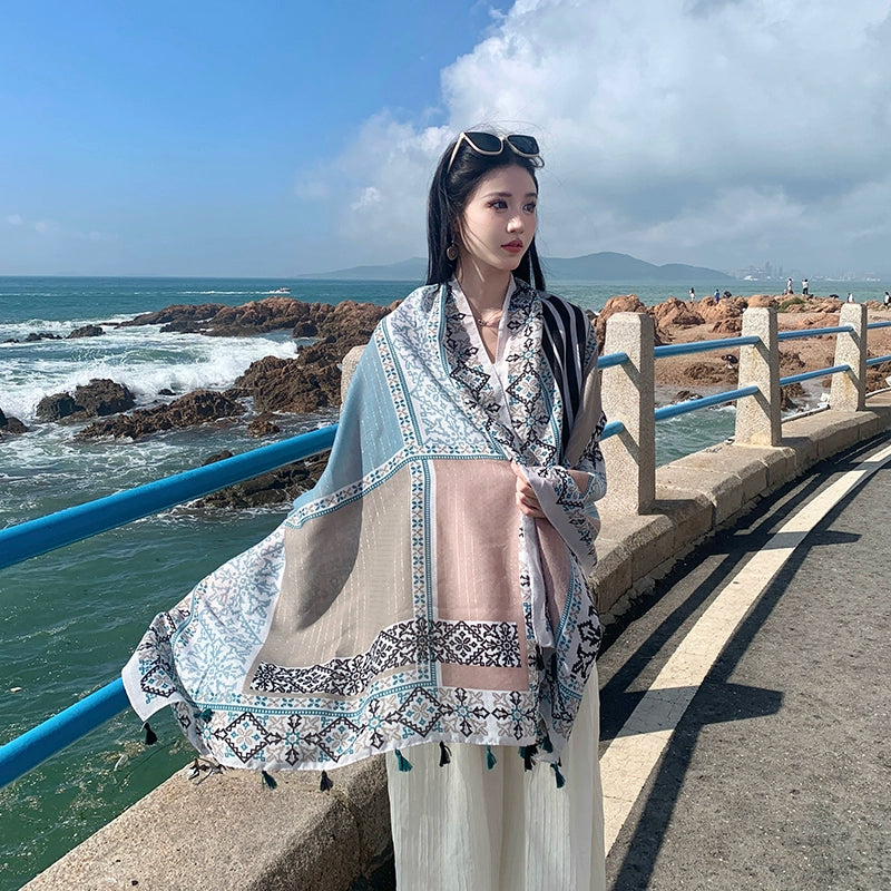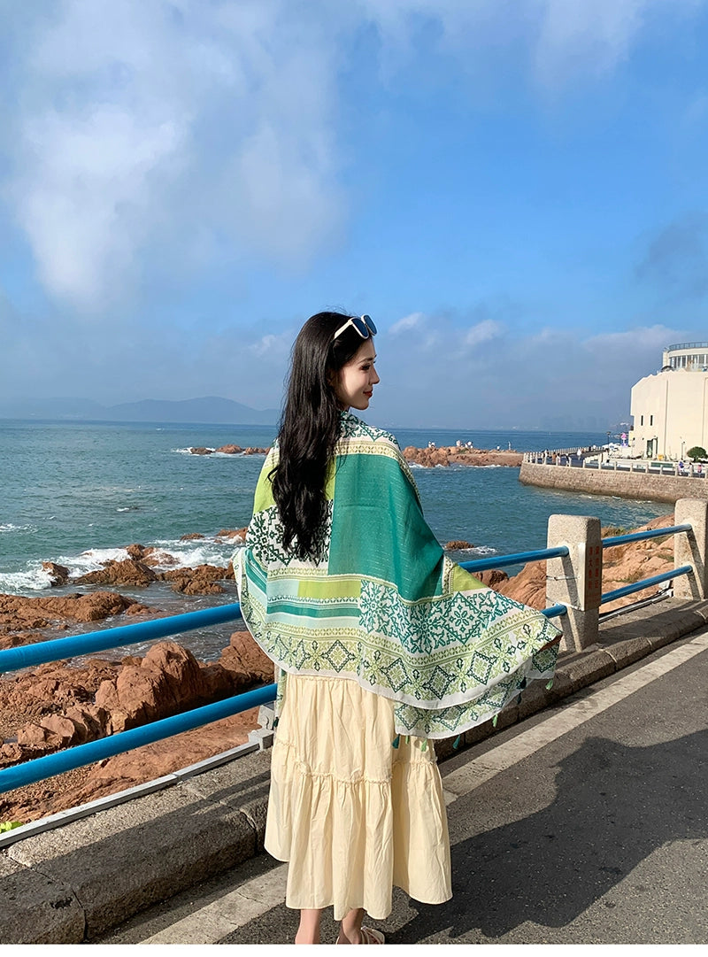 Fresh Green Ethnic Style Silk Scarf Women's Summer Sunscreen Dual-purpose Large Shawl Beach Towel Thin Cotton and Linen Scarf Yarn
