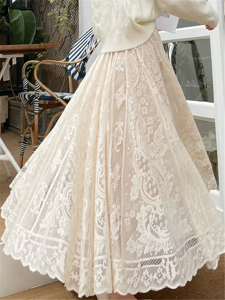 Vintage Women's Lace Crochet Umbrella Long Skirts Bohemian High Waist Hollow Out Female Maxi Skirts Spring Summer