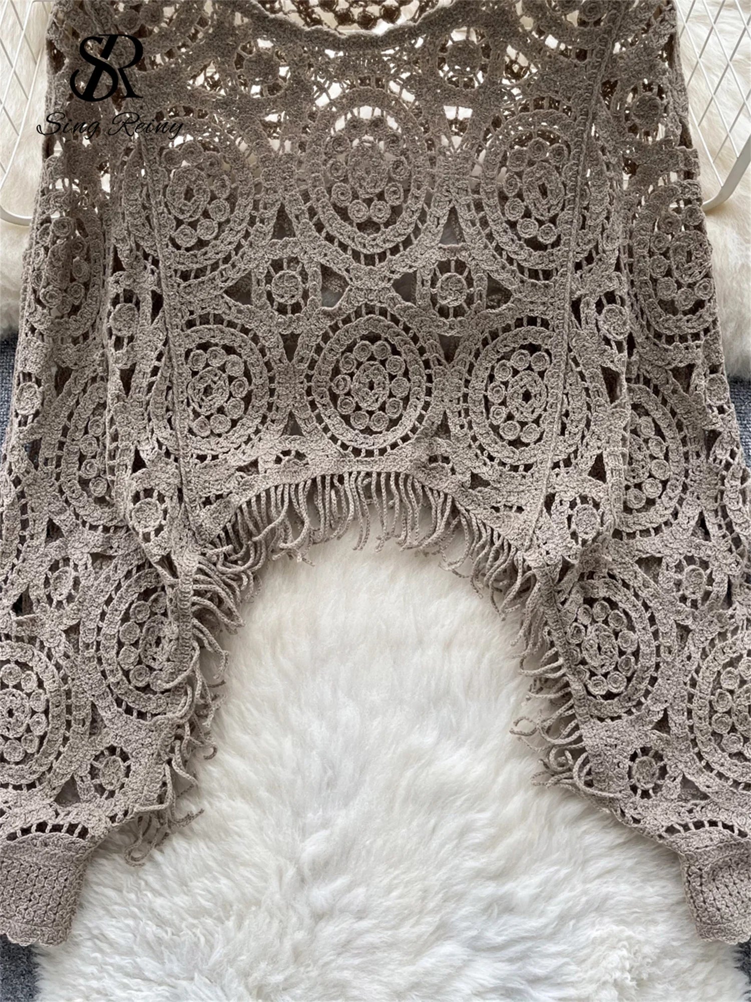 Autumn Casual Loose Knitting Top O Neck Hook Flower Hollow Long Sleeved Tassel Design Fashion French Vintage Blouse