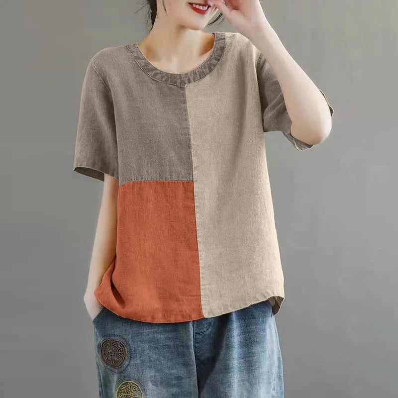 Women Patchwork Blouse 2024 Summer Short Sleeve Tunics Fashion Round Neck Shirts Casual Loose Holiday Cotton Linen Tops